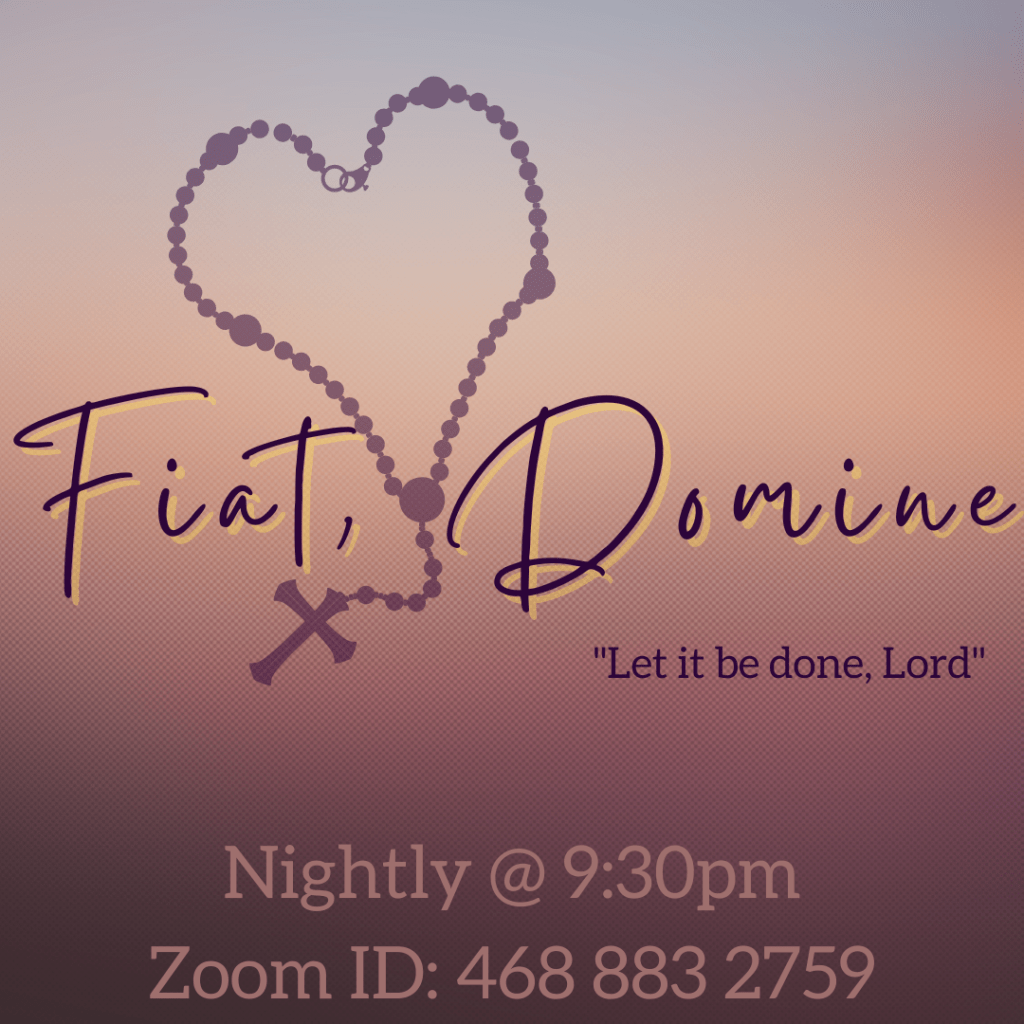 Group Prayer– Every night on Zoom, rosary is hosted by alumni and current students through Fiat, Domine. Rosary is prayed nightly throughout the year, and we may have in-person group prayer during the semester.